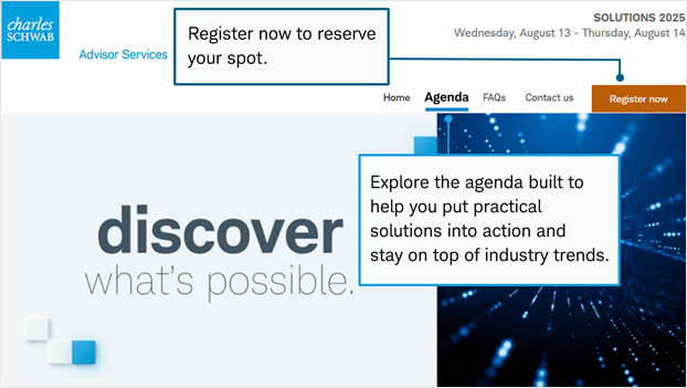 At Schwab's annual two-day virtual SOLUTIONS event August 13–14, you'll learn all about the latest enhancements to Schwab Advisor Center, along with practical tips that you can use to get the most out of your firm's technology stack.