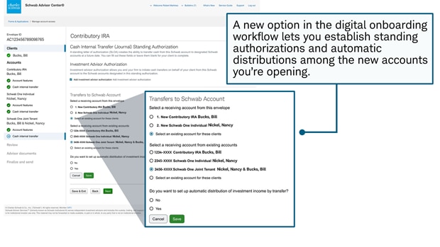 Now when you open new accounts in the digital onboarding workflow, you can establish internal transfer standing authorizations and automatic investment income distributions among new accounts in the same digital envelope. Previously, you had to wait until the accounts were opened before adding these features.