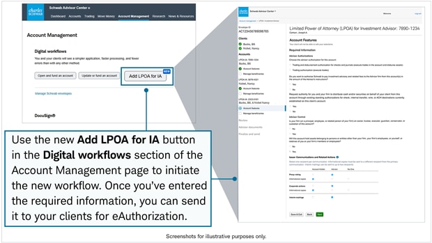 A new digital workflow now allows you to add or modify your firm's authority level on up to 20 of your clients' accounts in a single envelope. Previously, advisors had to use Docusign or a paper LPOA-IA form to make these changes. This feature is particularly helpful when onboarding new clients.
